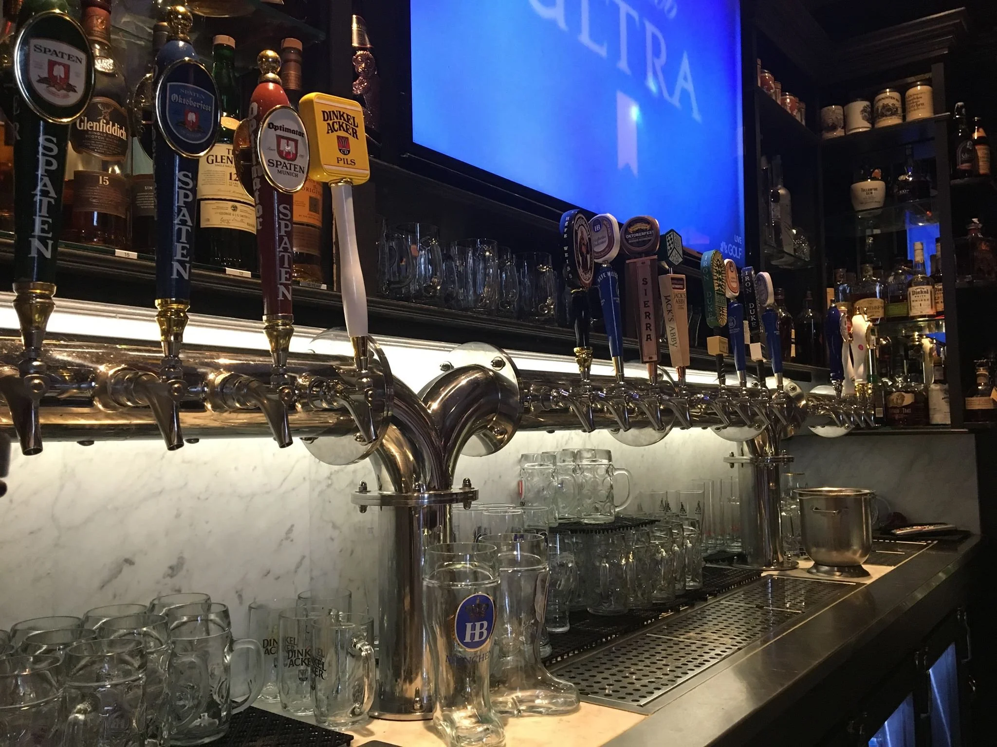 Bar with multiple beer taps, glasses, and bottles in the background, illuminated by soft lighting, digital screen on top, and a black shelving unit.